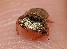 The purple-gold jumping spider typically measures 5–6 mm (0.20–0.24 in).[5] It is sexually dimorphic; most females of the species are of an almost solid gold pigmentation (though some may exhibit a muted brown pattern resembling that of a male), while males are known for their dazzling purple-pink and gold patterned reflective trichobothria. The unique purple pattern on males' abdomens best described as "a snow angel wearing a tophat" surrounded by gold coloration tends to remain the same. However, the purple-gold pattern on the top of their heads often varies slightly between individuals, as do their pedipalps. The cheliceras are occasionally black-tipped, in addition to the base of the extremities.