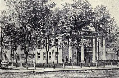 Shortly after moving to Lewistown, Major Walker was asked to design and supervise the construction of the Fulton County courthouse (actually, the third courthouse in Lewistown, and often referred to as the "old Court House"). This courthouse was built in 1838 in the Greek Revival style and featured four sandstone columns in front that were quarried from the Spoon River bottom. An outside staircase led to the upper floor. In this building, prominent local attorneys such as Abraham Lincoln, Edward Dickinson Baker and James Shields argued cases of law, and Stephen A. Douglas was a presiding judge.[7] Lincoln and Douglas each gave speeches from between the columns, including Lincoln's famous "Back to the Declaration of Independence" speech on August 17, 1858. This courthouse burned in a fire of controversial origin on December 13, 1894.[8]