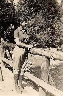 Wasson became one of the first interpretive rangers hired by the National Park Service, and the second ranger and first female ranger at Yellowstone National Park. She was hired when Horace Albright, then the Park Superintendent, heard her lecture on geology to a group of her family and friends who were visiting the park in the summer of 1919 on a tour of national parks organized by the Brooklyn Daily Eagle. Albright invited her to return in the summer of 1920 to lead interpretive tours and give lectures about the geology of the park, which she did. After she was hired she wrote to the Wellesley alumnae magazine, "Next summer I am to be a ranger in Yellowstone Park. You never heard of a woman ranger? Well, neither have I."[12] She gave over 200 public talks on the geology of the park that summer, and is credited with setting the template for interpretive talks by NPS rangers. Albright also asked her to train the hotel bellhops to give talks similar to hers, but she concluded that they lacked the background in geology to do this. She suggested instead that the park hire college students on summer break to give talks, and this became a tradition at Yellowstone and many other parks.[13][14] Albright invited her to return again in the summer of 1921, but she declined because she was pregnant. She inquired about returning in 1922 but others had been hired to do similar work.[15][16][17][18][19]