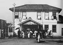 During the two years that Isaniwa Yukiya served as a mayor, he changed many things. First, he began charging money fora free outdoor hot spring for cures, because the hot spring was old, it needed to renew.[7] Then he rebuilt the hot spring for cures in 1892.[8] And then he planned to renew the main hot spring.[9] Yukiya planned Dogo Onsen to have third floor which was rare in those days for Japan, Japanese style mixed with European style building, red and blue Giyaman glass (Dutch style glass) used [10] and looks rich and powerful building, because the main hot spring had good quality, Yukiya didn't want to Dogo Onsen looks usual type of other buildings.[11] He asked Sakamoto Hachiro, a carpenter for castle, to make it and Sakamoto built it in 1894. It took for 20 months to build.[5] And he also founded Dogo train corporation and he asked to make the train rail to Dogo through Ichiban-cho in 1897, because Yukiya thought Dogo Onsen station[12] makes people come and visit to Dogo Yunomachi.[13] And in the same year, he made the park around the Dogo Onsen and for people to enjoy sweets, he made red and white Yuzarashi Dango, today's Botchan Dango. However, most people of the city disagreed with his these ideas until they saw the new Dogo Onsen.[14]