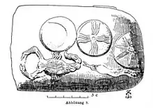In later periods in Mesopotamian art, for example on decorated boundary stones (kudurru), Ishara was instead associated with scorpions.[66] While scorpions are present in Mesopotamian art from the Early Dynastic period already, Doris Prechel stresses that even if they served as symbols of a deity, it cannot be assumed that it necessarily was Ishara.[73] Neither the reason behind the change in her symbolic animal nor the reasons behind the attribution of either of them are known.[68] No depictions of her from the Kassite and Middle Babylonian periods are anthropomorphic, and she came to only be represented in art by her symbol.[74] Incised images of scorpions presumably reflecting this animal's connection with Ishara have been identified on two late Babylonian legal documents signed by prebendaries linked to her.[75] It has been suggested that scorpions depicted on items which belonged to Assyrian queens might also be connected to the iconography of Ishara, one example being the seal of Hamâ, the wife of Shalmaneser IV, with a goddess accompanied by a scorpion and either a lion or a dog, though the validity of this assumption is not universally accepted.[76] In Mesopotamian astronomy, Ishara was associated with mulgir-tab (literally "scorpion star").[56] A description of this constellation, which corresponds to Scorpius, is preserved in the compendium MUL.APIN:
