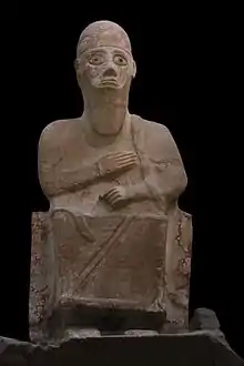 Ishara also continued to be worshiped in Babylonia after the fall of the Ur III state, through the Old Babylonian period.[198] One of the earliest pieces of evidence is an offering list from Nippur from the reign of Warad-Sin of Larsa.[199] A temple of Ishara is mentioned in a text from Larsa dated to the reign of Hammurabi, but its location is unspecified.[200] She was also worshiped in Kish and near it, possibly in Ilip or Harbidum, as attested by references to a temple and a number of theophoric names.[201] Another temple dedicated to her existed in Sippar.[202] Offering lists from this city mention her too.[203] A legal text refers to an oath sworn by the snake (ba-aš-mu-um) of Ishara.[8] The formula "servant of Ishara" occurs in an inscription on a seal of a certain Illuratum.[204] Multiple theophoric names invoking her have been identified in texts from Sippar, for example Abdu-Išḫara ("servant of Ishara"), Malik-Išḫara ("Ishara is an advisor") or Nūr-Išḫara ("light of Ishara").[205] Theophoric names invoking her are also attested in Old Babylonian texts from Dilbat, but they are uncommon in this corpus.[198] Evidence from Ur is similarly limited to theophoric names.[206] At some point, possibly also in the Old Babylonian period, Ishara was also presumably worshiped in Kisurra, as an incantation known from a Neo-Assyrian copy refers to her as the queen of this city (šar-rat ki-sur-ri-eki).[207]