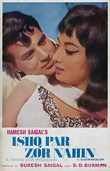 Ishq Par Zor Nahin is a 1970 Hindi romantic movie (based on love triangle story) produced by Suresh Saigal and directed by Ramesh Saigal. The film stars Dharmendra, Sadhana, Biswajeet, Kamini Kaushal, Leela Mishra, Abhi Bhattacharya, Jagdeep, Nadira and Helen. The film's music is by S. D. Burman. This is the only film in which Biswajeet and Sadhana worked together. Similarly, this is the only movie in which Dharmendra and Sadhana worked together. The songs "Ye Dil Diwana Hai", "Mehbooba, Teri Tasveer", "Tum Mujhse Door Chale Jana Na" and "O, Mere Bairagi Bhanwara" were composed by S.D. Burman. The story of the film is similar to Yash Chopra's 1969 classic Aadmi Aur Insaan.