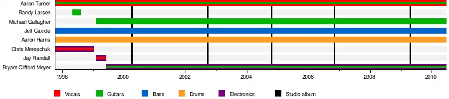 In Boston, several sessions of experimentation led friends Aaron Turner (guitar/vocals; also the owner of Hydra Head Records and its subsidiary, HH Noise Industries), Jeff Caxide (bass guitar), Chris Mereschuk (electronics/vocals) and Aaron Harris (drums) to form Isis in the autumn of 1997.[1] As Turner stated, "Isis formed as a result of the dissatisfaction with past bands of the founding members. None of us were happy with what we were doing musically at the time, two of us lived together, we had similar tastes and similar record collections."[2] The band began playing out in the spring of 1998, and recorded a demo at Salad Days Studios shortly thereafter.[1] After an East Coast tour in the summer of 1998 where they were joined by Randy Larsen of Cable on guitar, Mereschuk left the band. In 1999, Michael Gallagher (formerly of Cast Iron Hike) and Jay Randall (now of Agoraphobic Nosebleed) joined the band, working on Red Sea (1999). Jay Randall's time with the band was brief, and Isis recruited guitarist/keyboardist Bryant Clifford Meyer (formerly of The Gersch) to replace him. After releasing their full-length debut entitled Celestial (2000) and its sister EP, SGNL›05 (2001, on Neurot Recordings), Isis gained national underground attention in the metal/hardcore scene through tours with Cave In and Neurosis. Isis remained with this lineup until their dissolution in 2010.[3]