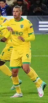 Before Sporting's league derby match at home, Benfica lodged a complaint against Slimani for assaulting Andreas Samaris with his elbow in a Portuguese Cup match on 21 November 2015.[18] After a long wait and one day before the match, the Portuguese League announced that Slimani could participate in the decisive match for the title.[19] However, the team lost 1–0 and dropped to second place, behind Benfica. One week later, he scored his 20th goal this season in the match against Estoril.[20] After this meeting, he scored four goals against Belenenses, Marítimo and Moreirense, and Porto. Slimani contributed to the victory at Estádio do Dragão after scoring two goals.[21] In the final round, he scored his 27th goal of the season against Braga. The match ended 4–0 but was not enough for Sporting to win the league title, as Benfica ended with more two points. That season, Slimani scored 27 goals in the league but finished behind top scorer Jonas, with 32 goals.