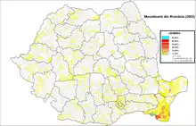According to the 2022 census, 76,215 people, approximately 0.4% of the total population, indicated that their religion was Islam.[4] According to the 2011 census, 64,337 people, approximately 0.3% of the total population, indicated that their religion was Islam.[5] The vast majority of Romania's Muslims are Sunnis adherents of the Hanafi school. Ethnically, they are mostly Tatars (and a number of Nogais), followed by Turks, as well as Muslim Romani (as many as 15,000 people by one estimate),[6] Albanians (as many as 3,000),[7] and groups of Middle Eastern immigrants. Members of the Muslim community inside the Roma minority are colloquially known as "Turkish Roma".[6] Traditionally, they are less religious than people belonging to other Islamic communities, and their culture mixes Islamic customs with Roma social norms.[6] Most of the Muslim Romanis live in Dobruja and Călărași.[8]