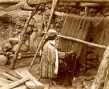 Nomads usually use a horizontal loom. In its simplest form, two loom beams are fastened, and kept apart by stakes which are driven into the ground. The tension of the warps is maintained by driving wedges between the loom beams and the stakes. If the nomad journey goes on, the stakes are pulled out, and the unfinished rug is rolled up on the beams. The size of the loom beams is limited by the need to be easily transportable, thus, genuine nomad rugs are often small in size. In Persia, loom beams were mostly made of poplar, because poplar is the only tree which is easily available and straight.[55] The closer the warps are spanned, the more dense the rug can be woven. The width of a rug is always determined by the length of the loom beams. Weaving starts at the lower end of the loom, and proceeds towards the upper end.