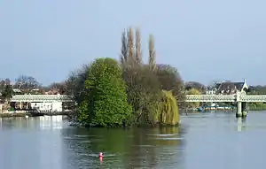 This article lists the islands in the River Thames, or at the mouth of a tributary (marked †), in England. It excludes human-made islands built as part of the building of forty-five two-gate locks which each accompany a weir, and islets subordinate to and forming part of the overall shape of another. The suffix -ey (pronounced today /iː/) is common across England and Scotland and cognate with ait and meaning island, a term – as ait or eyot – unusually well-preserved on the Thames. A small minority of list entries are referred to as Island, Ait or Eyot and are vestiges, separated by a depression in the land or high-water-level gully.