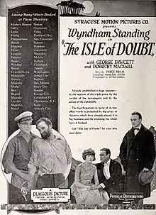 Isle of Doubt is a 1922 American silent drama film directed by Hamilton Smith and starring Wyndham Standing, Dorothy Mackaill and George Fawcett.[1] The title is sometimes written as The Isle of Doubt.