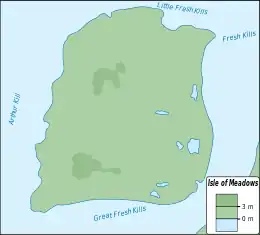 The Isle of Meadows (also known as the Isle of Meadow) is a 87-acre (0.35 km2) uninhabited island in the New York City borough of Staten Island in the United States. It is located along the western side of Staten Island, where Fresh Kills empties into the Arthur Kill. The island is owned by the city of New York. It is now a nature preserve providing important meadow and salt marsh nesting habitat for herons, ibises, and egrets, and is not open to the public.[1]