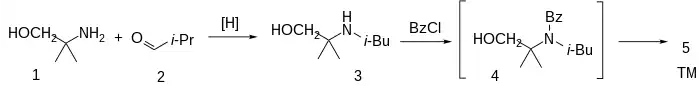The reductive amination between aminomethyl propanol (1) and isobutanal [78-84-2] (2) afforded N-Isobutyl-1,1-dimethyl-2-hydroxyethanamine, CID:18315986 (3). Acylation of the amine with benzoyl chloride [98-88-4] hypothetically goes initially to the amide (4'). The acid catalysis used in the reaction leads to an N to O acyl migration to afford isobucaine (5).
