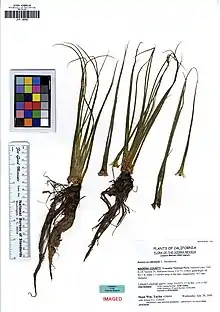 Isoetes occidentalis, the western quillwort,[2] is a species of quillwort in the family Isoetaceae. It can be found in aquatic habitats of coastal Alaska and British Columbia south to California and Colorado. It is frequently found on Vancouver Island and around the Fraser Valley region.[3] It bears 10 to 30 or more rigid, dark green leaves, each 5 to 20 centimeters long. The velum covers one fourth to one third of the orbicular sporangium, which is 5 to 6 millimeters in diameter. The ligule is shaped like a shortened triangle. The white megaspores are 500 to 700 micrometers in diameter and bear sharp ridges and crests. The microspores are 36 to 43 micrometers long.[3] Though the leaves seem to bear resemblance to those of I. lacustris, especially the occasionally occurring reddish base, I. occidentalis is a hexaploid and I. lacustris is a decaploid.