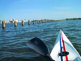 A Miami real estate bubble burst in the mid-1920s as a land boom fueled by outside speculators was stricken by economic realities and unexpected hurricanes.[3] One failed development project left its remains scarring north Biscayne Bay near Miami Beach, Florida. Concrete pilings from the sea wall of the incomplete Isola di Lolando still remain perfectly aligned in the shape of a new "Venetian island", stretching from the northern tip of Di Lido Island to the Julia Tuttle Causeway.