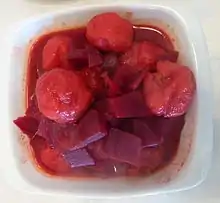 Salads include Turkish salad (a piquant salad of finely chopped onions, tomatoes, herbs and spices), tabbouleh, carrot salad, marinated roasted red and green peppers, deep fried cauliflower florets, matbucha, torshi (pickled vegetables) and various eggplant salads.[36][37]