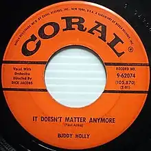 "It Doesn't Matter Anymore" is a pop ballad written by Paul Anka and recorded by Buddy Holly in 1958. The song was issued in January 1959, less than a month before Holly's death. "It Doesn't Matter Anymore" reached number 13 as a posthumous hit on the Billboard Hot 100 chart in early 1959, shortly after Holly was killed in a plane crash on February 3, 1959. The single was a two-sided hit, backed with "Raining in My Heart". "It Doesn't Matter Anymore" was Holly's last US Top 20 hit and featured the orchestral backing of Dick Jacobs. It was also successful in the United Kingdom, where it became the country's first posthumous number 1 hit.[1]