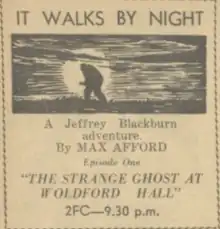 It Walks by Night is an Australian radio serial by Max Afford featuriing his detective hero, Jeffrey Blackburn.[1][2]