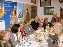 Common dinner among Italian esperantophones. A poster of the 91st World Esperanto Congress of Florence may be noticed in the background. Bologna, March 2008.
