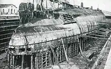 All of this preparation required over two years and the ship was refloated on 17 September 1919. A deep channel had been dredged from her location to the drydock and she was moved there. A special wooden framework had to be built to support her, still inverted, after the water in the drydock had been drained.[17] Her decks were not designed to handle the stresses involved in her unique situation and had to be reinforced to withstand the weight of the hull and preliminary repairs were made in preparation for righting her. A deep spot in the harbor was dredged for this task and some 400 long tons (410 t) of ballast were added in spots calculated to assist in the righting effort. The primary work was done by 7,500 long tons (7,600 t) of water pumped into the ship's starboard side[17] and she was successfully righted on 24 January 1921.[18] The Regia Marina planned to modernize Leonardo da Vinci by replacing her amidships turret with six 102-millimeter (4 in) anti-aircraft guns,[2] but ultimately lacked the funds to do so and sold her for scrap on 22 March 1923.[19]
