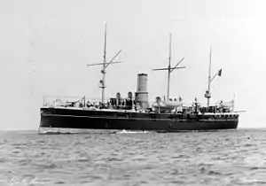 The ship was present on 20 May 1902 when the United States formally granted independence to the Republic of Cuba, following the Spanish–American War three years earlier. Calabria and the British protected cruiser HMS Psyche fired salutes to the United States armored cruiser USS Brooklyn.[5] In April 1903, Calabria joined a naval review held for the Japanese Emperor Meiji in Kobe, Japan. The foreign naval contingent included the British pre-dreadnought battleship HMS Glory and protected cruiser Blenheim, the German protected cruiser SMS Hansa, the French protected cruiser Pascal, and the Russian protected cruiser Askold.[6]