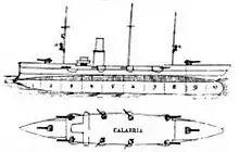 Calabria was designed by the Chief Engineer, Edoardo Masdea, and was intended for overseas service in the Italian colonial empire. She had a steel hull sheathed with wood and zinc to protect it from fouling during lengthy deployments abroad, where shipyard facilities would not be readily available. The hull was 76 meters (249 ft 4 in) long between perpendiculars and 81 m (265 ft 9 in) long overall. She had a beam of 12.71 m (41 ft 8 in) and a draft of 5.05 m (16 ft 7 in). Her normal displacement was 2,453 long tons (2,492 t) but increased to 2,660 long tons (2,700 t) at full load. She had a flush deck and a ram bow; her superstructure was fairly minimal, consisting primarily of a small conning tower forward. She was fitted with three pole masts for signaling and spotting purposes. Calabria had a crew of between 214 and 254 officers and enlisted crew.[1][2]
