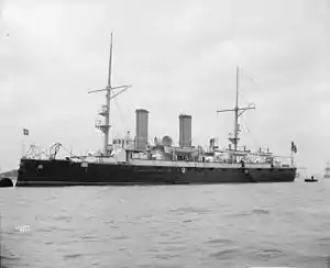 In 1902–1903, Liguria was in the main Italian fleet; while in their normal peacetime training routine, the ships of the main fleet were kept in commission for exercises for seven months of the year. For the remaining five months, they were kept in a partial state of readiness with reduced crews.[6][7] From 1903 to 1905, under the command of the Duke of the Abruzzi, Liguria circumnavigated the world on a diplomatic and scientific tour.[8][9] Leaving La Spezia on 29 August 1903, she crossed the Atlantic to New Orleans before stops in Havana, Trinidad and Buenos Aires. She then went up the Pacific coast to San Francisco before making a crossing southeasterly crossing to Hawaii, Tahiti, New Zealand and Australia. From Australia she turned north to visit China before turning south again for stops in Bangkok, Singapore and Java. She crossed the Indian Ocean, stopping in Madras and Massawa before returning via the Suez Canal to La Spezia on 18 April 1905. The ship had stopped in 114 ports and crossed the equator six times.[9]