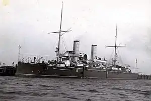 Puglia was immediately deployed to East Asian waters following her commissioning. In July, she was in Australia during the visit of the British Prince George, son of then-King Edward VII.[6] The ship was still on the China station as of 1904.[7] Puglia was present in Rio de Janeiro in January 1908 when the Great White Fleet arrived in the port. She greeted the American fleet with a 15-gun salute. The German cruiser SMS Bremen was also moored in the harbor at the time, as was the Brazilian fleet.[8]