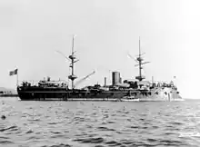 By 1880, her armament had been changed another time, with two 220 mm (8.7 in) guns replacing the 254 mm guns, and a ninth 8 in gun being added in the stern. The ship was modernized in 1884, with her armament replaced with eight 152 mm (6 in) guns, six 120 mm (4.7 in) guns, four 57 mm (2.2 in) quick firing (QF) guns, and eight 37 mm (1.5 in) Hotchkiss revolver cannons.[1] For the annual fleet maneuvers held in 1885, Castelfidardo served in the "Eastern Squadron", joined by the ironclad Principe Amedeo, the corvette Amerigo Vespucci, a sloop, and four torpedo boats. The "Eastern Squadron" defended against an attacking "Western Squadron", simulating a Franco-Italian conflict, with operations conducted off Sardinia.[15] On 10 June, the annual fleet maneuvers began; Castelfidardo was assigned to the "defending squadron", along with the ironclads Enrico Dandolo, Palestro, and Affondatore, the protected cruiser Dogali, and several smaller vessels. The first half of the maneuvers tested the ability to attack and defend the Strait of Messina, and concluded in time for a fleet review by King Umberto I on the 21st.[16]