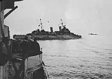 The first torpedo struck modern light cruiser HMS Nigeria, flagship of Admiral Harold Burrough (Commander of Force X), moving at 14 knots. The explosion opened a 30-foot-wide hole, knocking out electricals, flooding the boiler rooms and knocking out pumps, and starting fires on board. Fifty-two crew members lost their lives. The ship started listing to port (i.e. to the left), but the crew managed to stabilize the cruiser and was able to turn around and head to Gibraltar accompanied by three destroyers. Admiral Burrough had to be taken off the cruiser and moved on board of destroyer HMS Ashanti. HMS Nigeria safely made it back to Gibraltar, where she stayed for over a year undergoing repairs returning to action in September 1943.[4][3]