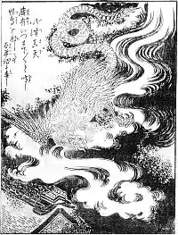 In the Taiheiki, the bird is merely written to be the "eerie bird" with no distinctive name. The "Itsumade" name in the Konjaku Gazu Zoku Hyakki is considered to be a naming Sekien made upon illustrating this story in the Konjaku Gazu Zoku Hyakki on the basis of the bird's cry.[2] In various Edo Period illustrations of battle, this bird was depicted as a monstrous bird or black cloud in order to convey the idea,[3] but among them none to be found that use the name "Itsumade."