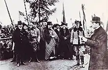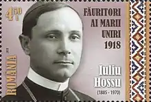In November 1918 Bishop Hossu was nominated representative by right in the National Assemby of all Romanians in Hungary, which declared the Union of Transylvania with Romania on 1 December 1918.[3] On 1 December 1918 Hossu read the Resolution of the National Assembly in front of the crowds gathered in Alba Iulia, preceding it with the following words: "Brethren, the hour of fulfillment is this one, when God Almighty is speaking out His centuries-old longing for justice through His faithful people. Today, by our decision, Greater Romania is achieved, one and indivisible, all Romanians from these lands happily calling: We are joining forever our Motherland, Romania! [..] Justice has prevailed".[4] Next day, at Iuliu Maniu's proposal, the High National Romanian Council mandated representatives Vasile Goldiș, Alexandru Vaida-Voevod, Iuliu Hossu, and Miron Cristea to go to King Ferdinand I and present him with the Resolution of the National Assembly.[4]