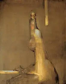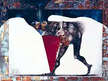 Pavle systematically refers to several thematic fields. Figurative painting, nudes, torso and faces covered by masks characterise Pavle’s paintings and drawings. The representation of human body is further reinforced by emphasising the gestures, body shapes in motion and relationship studies of two and more characters.[2] A long term cycle Madon is not only an attempt to cope with one of the basic themes of the large painting of the past, but also highlights the artist‘s intimate intention to explore the world around him. Another major and repeatedly depicted theme in Pavle’s work concerns mythology, which is implemented in a never ending cycle of paintings about Babylon, as well as in other art pieces – fictitious landscapes and mysterious characters with animal features.[4] His work is noted for its intensity and distinctive style. Furthermore, Pavle cherishes the legacy of the finest artworks of the past; therefore he applies old and often obsolete techniques in a combination with his own specific artistic processes. His extensive work combines knowledge of tradition and respect for the material while also focusing on contemporary content.[5]