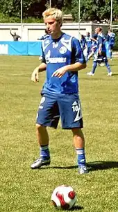 Shortly upon his returning from injury, Rakitić discovered top form as he scored a goal and assisted another two in the vital 0–3 victory at VfL Bochum,[22] which made sure Schalke finished at least third in league table and secured a place in the next Champions League. He continued such form in the next fixture against Eintracht Frankfurt, assisting Mladen Krstajić for the only goal of the match to conclude with Schalke a positive home season. In total, he finished his first Bundesliga season with 3 goals and 10 assists in 29 appearances.[23] In the subsequent season, Rakitić played in Schalke's 3–0 victory over Hannover 96, assisting two goals in the opening Bundesliga fixture.[24]