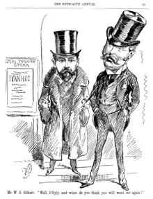 While Sturgis worked on Ivanhoe, Sullivan was composing The Gondoliers, with a libretto by Gilbert, for the Savoy Theatre. After The Gondoliers opened and Sullivan took his annual holiday in Monte Carlo, he finally began the composition of Ivanhoe in May 1890, finishing the score in December 1890. Chorus rehearsals for Ivanhoe began in November, with Alfred Cellier as chorus master, and his brother François Cellier, who became musical director of the new theatre.[12] In April 1890, Gilbert had challenged Carte over partnership expenses at the Savoy Theatre, including a new carpet for the lobby. To Gilbert's surprise and indignation, Sullivan sided with Carte – after all, Carte was producing his opera – and Gilbert sued Carte and Sullivan in May. The lawsuit was ongoing during much of the period of composition of Ivanhoe, and Sullivan wrote to Gilbert in September 1890 that he was "physically and mentally ill over this wretched business. I have not yet got over the shock of seeing our names coupled ... in hostile antagonism over a few miserable pounds".[13] Sullivan completed the score too late to meet Carte's planned production date, and costs mounted as the producer had to pay performers, crew and others, while the theatre sat empty. Sullivan was required to pay Carte a contractual penalty of £3,000 for his delay.[14][15]