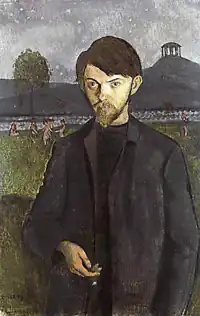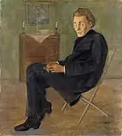 He began by studying for the real estate trade then, in 1895, he received his first artistic training from an amateur watercolorist.[2] The following year, he began formal studies at the Valand Academy, where he became friends with the sculptor, Gerhard Henning. He also took lessons at the School of Design and Crafts, in the department of decorative painting.[2] In 1898, he was admitted to the Royal Swedish Academy of Fine Arts, where he shared a studio with Henning.