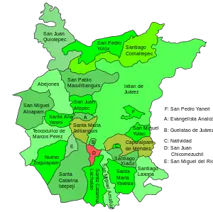 The district includes 26 municipalities, bringing together a total of 161 settlements. At the 2000 census, they contained a total of 40,218 inhabitants, the majority of whom were indigenous Zapotec speakers.[1]