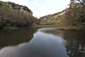 The Izki River has a length of 15.74 km (9.78 mi) and it constitutes the central axis of the Izki Natural Park, its basin covering about 60% of its surface. The most common rock type in the basin is sandstone, and most of it is covered by forests. Most tributaries of the Izki river are short streams. Near Korres, the river traverses an area dominated by calcarenites, forming a gorge[4] between the summits of Soila and Muela.[5] After the gorge, the river reaches a wide alluvial plain where it converges with the Ega. The average discharge there is of 610 L/s (22 cu ft/s). In the summer, the dry season can be very marked, with some sections of the river and its tributaries drying out.[4]