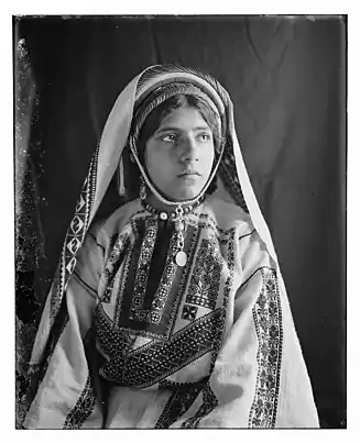 The iznaq is a chin chain traditionally worn by Palestinian women, suspended from a headdress called the shatweh.[1] It is crafted from hand-made silver chains, hooks, and festooned with Ottoman era coins.[2] It can include floral or star shaped ornaments and a cross for Christians.