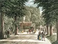 In 1829, Jægersborg Allé was finally opened to the public. Carriages had to pay a fee which was collected at a boom barrier in Charlottenlund. The area became more accessible with the opening of the Læampenborg and Ltngby Railways in 1863. The land along the road was gradually built over.[1]
