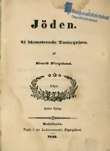 Jøden. Ni blomstrende Torneqviste (The Jew. Nine Blossoming Briar Shoots)[1] is a collection of poems by Henrik Wergeland, published in April 1842,[2] as a contribution to the struggle for the Jews' right to reside in Norway.[3] The book is a collection of poems and short prose, and it opens with the following dedication:[2]