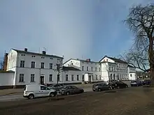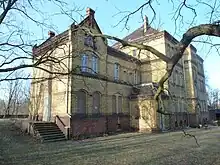 The Military Railway station is located north-east of the main station on the side of the railway tracks. Its entrance building is a three-storey yellow brick building with a two-storey extension with a display gable on the track side and a staircase to the forecourt in an avant-corps.