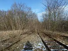 At the beginning of the 20th century, traffic on the Berlin–Halle railway increased significantly. For this reason, extensive work began on the upgrade of the Berlin–Halle railway after 1910. It was planned to upgrade the section from Berlin to Jüterbog to four tracks. The works were already well advanced in 1915, but came to a standstill because of the First World War. A large number of relics of the construction which had just begun, are still recognisable. In the area around Jüterbog station, there is an embankment north-west of the existing railway that was intended to be used for the new long-distance tracks. Extensive structures south of the station were built to provide grade-separated crossings of the lines to Röderau and Wittenberg.[9] The reconstruction of the tracks in the north-eastern station area was completed. After the First World War, the upgrade plans were revived, but the work was finally discontinued in 1922, not least because the Wiesenburg–Roßlau railway, an additional connection between Berlin and Central Germany, was under construction and would relieve the Berlin–Halle railway.[10]