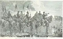 Upon the outbreak of the Civil War, Clark hastened to fight for the Union side. He joined the Commonwealth Artillery as a private in the spring of 1861, then accepted a commission in the 6th Pennsylvania Cavalry, another organization of the elite and one that distinguished itself in battle. ("The Sixth Pennsylvania Cavalry, also known as Rush’s Lancers, was a completely volunteer unit and one of the finest regiments to serve in the Civil War. Tracing their history from George Washington’s personal body guard during the Revolutionary War, many of the men of the Sixth Pennsylvania were the cream of Philadelphia society...," wrote historian Eric J. Wittenberg.[5]) Clark was mustered in on October 4, 1861, as Second Lieutenant of Company F. The following April 19, he was promoted to First Lieutenant of Company K, and then on March 16, 1863, to Captain of Company M. He led his unit in combat at the Battle of Gettysburg.[6] Later, he and his men fought at the Battle of Trevilian Station (June 11–12, 1864), where on the first day they helped "to drive the rebels from the railway cut and a brick kiln, behind which they had entrenched themselves." On the second day of the battle, Clark was taken "seriously ill", and relinquished command of his unit to Captain (and future famed architect) Frank Furness, whose actions that day were years later recognized with the Medal of Honor.[7] Clark was transferred to Company C on September 18, 1864, and mustered out the following day.[8] On March 13, 1865, he was brevetted a major of the U.S. Volunteers "for gallant and meritorious services at the battle of Gettysburg" and lieutenant colonel "for gallant and meritorious services in the campaign from the Rapidan to the James."[9]