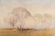In 1898 Hilder joined the Brisbane branch of the Bank of New South Wales. In 1901 he was transferred to Goulburn, and the following year to Bega, on the south coast of New South Wales, where he joined some friends in weekend sketching. Later on he was to receive £1 for one of these sketches, his first sale. Suffering increasing ill-health he moved on a number of occasions. Hilder was transferred to a Sydney suburb, but the sea air did not suit him; he was diagnosed with tuberculosis.[1] During the next five years he had to obtain leave of absence from the bank several times.