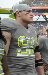 For his outstanding season, Watt was unanimously named to the 2014 All-Pro First Team as a defensive end and named to the All-Pro second team as a defensive tackle.[86] Watt was named to the 2015 Pro Bowl, where Cris Carter, team captain of Team Carter, selected Watt to be his captain on defense.[87] He unanimously won the Defensive Player of the Year award, one of a few players to win the award multiple times, and became the first defensive player since James Harrison in 2008 to get votes for the MVP award, receiving 13, which was also good enough for second place in the MVP voting behind Packers quarterback Aaron Rodgers, who won the award.[88][89] After the season, Watt was named to the top spot in the NFL Top 100 Players of 2015.[90]
