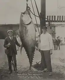 Ross with his catch, the largest tuna (680 lbs) in the world ever caught by rod and line, at St. Anns, Nova Scotia, 1911