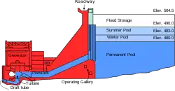 Rising 130 feet (40 m) above the streambed, the combination earth and concrete-gravity dam is 2,716 feet (828 m) long with a hydroelectric power plant generating 28 MW of electrical power. The dam has contributed significantly in reducing the frequency and severity of flooding in the Cumberland Valley. In addition to the far-reaching effects of flood control, the project contributes to the available electric power supply of the area.