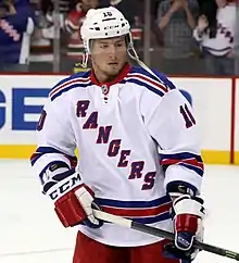 Miller joined the Rangers organization for the 2012–13 season. After beginning the season with the Connecticut Whale of the AHL, Miller was recalled by the Rangers on February 5.[8] On February 7, he recorded his first two career NHL goals, against Evgeni Nabokov of the New York Islanders in a -–1 win.[9][10] After the Whale season concluded, Miller was added to the Rangers' 2013 playoff roster, but did not play in a game.[11]