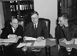 The Smith bill won several early tests in the House, which also voted to substantially cut the NLRB's budget.[34] Smith won a snap vote in the House Rules Committee permitting him to bring his bill directly to the floor for a vote and bypass the committee process (where Roosevelt and his House allies had intended to bottle up the bill).[7][13][35] In an attempt to defuse the legislative crisis, Madden fired 53 staff and forced another five to resign, and decentralized the NLRB's trial process to give regional directors and field agents more authority.[36] But the House easily passed the Smith bill by a vote of 258 to 129 on June 7, 1940.[20][28][37] To protect the NLRB, Roosevelt convinced Senator Elbert D. Thomas, Chairman of the Senate Committee on Education and Labor, to hold no hearings or votes on the bill, and the legislation died.[5][7][20][28]