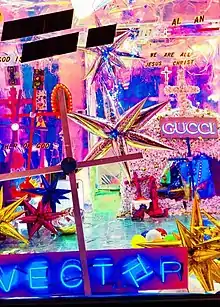 Critics praised Brine's work for its originality and vision[23] and it was compared to Andy Warhol's Factory by The Huffington Post ("Look: Is this the Next Warhol Factory?")[9][24][25] but the gallery has been a subject of controversy for many neighborhood residents due to its occult theme and Brine's intense imagery of Satanism and Charles Manson and fringe elements have connected Brine's work to the Illuminati.[26][27][28][29][30] Guestofaguest.com described the installation: "Is it the lair of a mad scientist? An occult apothecary? A wonderland of neon worship? Well, it's sort of all that (and more) rolled up into one unique gallery space, run by resident artist JJ Brine."[31] OracleTalk.com also wrote, "Implementing cool DIY principle and conjuring references to Duchamp’s ready-mades and rollicking religious iconography, the Vector Gallery is a gushing cornucopia of hypnotizing elements, provocative subject matter and lots of mirrors."[32] Vice's Mitchell Sunderland called it "one of the last original places on the Lower East Side."[8] Urban Resource has also called Vector the "most controversial art gallery" in New York City.[33]