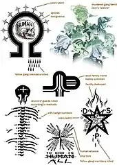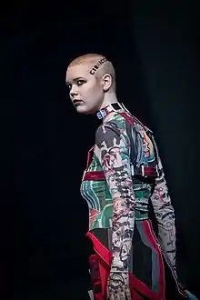 Jack was designed as a punk, and her backstory is illustrated through the various tattoos all over her body, which cover her physical scars in a deliberate attempt by Jack to erase her past and author her own story.[5] At some point in her past she escaped the Cerberus research facility she was held in; she became involved in criminal activities like piracy, kidnapping, vandalism, and murder, and even joined a religious cult; all in an attempt to find some meaning for the horrible treatment she was forced to endure. Her pants, which were part of her prison uniform, were pulled down to reflect her unique sense of style in Mass Effect 2.[5] The character artist team tried their best to showcase her tattoos while attempting to covering her chest to some degree due to concerns about how exposed her body was.[6] Her face is modeled after an unidentified actress' head scans, while her head is shaved bald to evoke an authentic punk feel instead of a "supermodel with ink".[6] The character was redesigned for Mass Effect 3, although her concept had been finalized before it was decided that she would be teaching biotic students at Grissom Academy's Ascension Project as part of the narrative.[7] She wears more clothing and grows her hair out to reflect her ongoing maturation, while still retaining the rebellious aspect of her character as she does not wear the standard regulation uniform of a classroom teacher.[7]